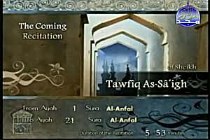 Sheikh Tawfiq As-Sa'igh recites from Surat Al-Anfal verse no. 1 to verse no. 21.